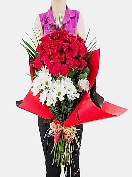Kırmızı Güller ve Pembe Papatyalı Buket