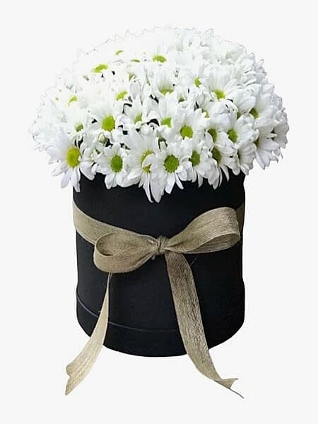 Siyah yuvarlak kutu içerisine 50 adet beyaz papatyalardan tasarlanmış şahene bir aranjman.